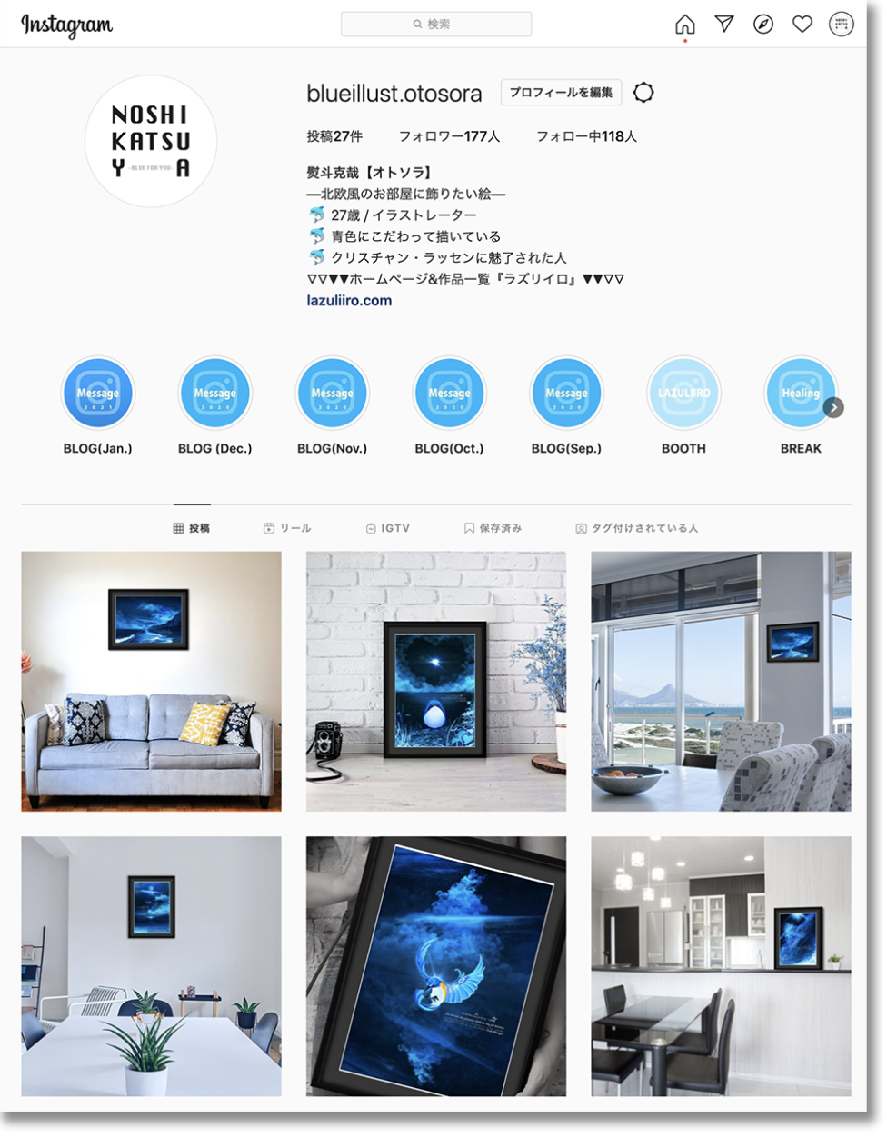 こちらのインスタグラムにも、青色アートの作品がまとめられていますので、